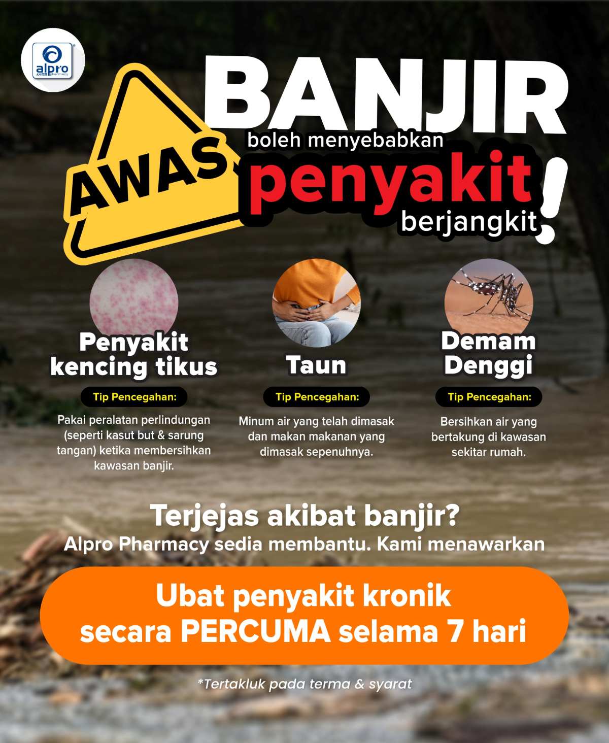 According to Pharmacist Lim En Ni, Chief Pharmacist and Director of Engagement at Alpro Pharmacy, flood conditions bring a heightened risk of infectious diseases as well as complications for patients with long-term illnesses. “When floodwaters rise, the risks of leptospirosis, cholera, dengue and various skin infections increase significantly due to contaminated water, reduced sanitation and the rapid breeding of mosquitoes. At the same time, patients with chronic diseases such as diabetes, hypertension and heart conditions are at much higher risk if their treatment is disrupted. It is vital for them to remain on their medications,” she said.