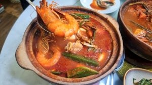 The default ingredient for Asam Pedas is the red snapper fish. You may order different proteins like prawns, octopus, stingray, mackerel and many more, priced according to the weight of the protein you order.