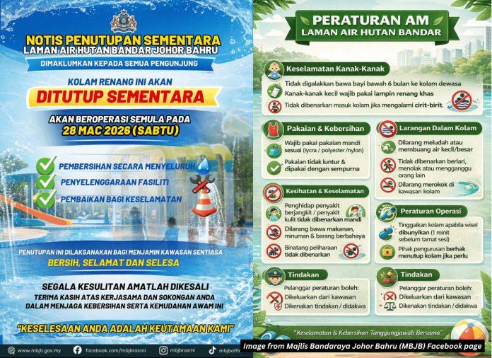 Johor Bahru City Council (MBJB) has announced the temporary closure of the newly opened public pool in Hutan Bandar, Johor Bahru, following human excrement found at the side of the kids’ pool.