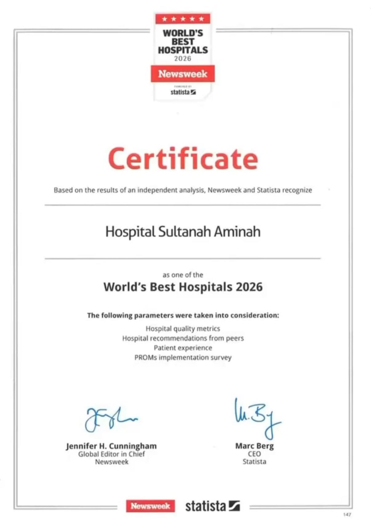Hospital Sultanah Aminah (HSA) has been recognised by Newsweek and Statista as one of the World’s Best Hospitals in 2026.