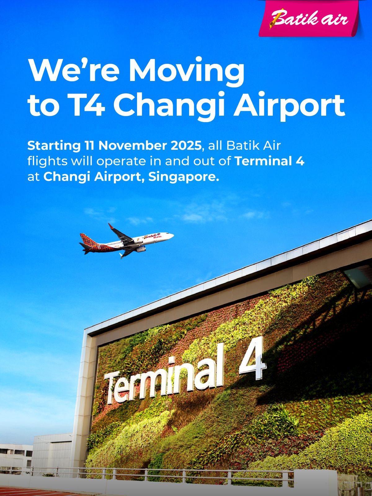 With the Terminal 4 move and new services, Batik Air makes travel more comfortable, convenient, and flexible. Passengers are encouraged to check their flight details and plan ahead, and can look forward to faster processes, modern facilities, and more opportunities to explore Southeast Asia – all from Singapore’s award-winning airport.